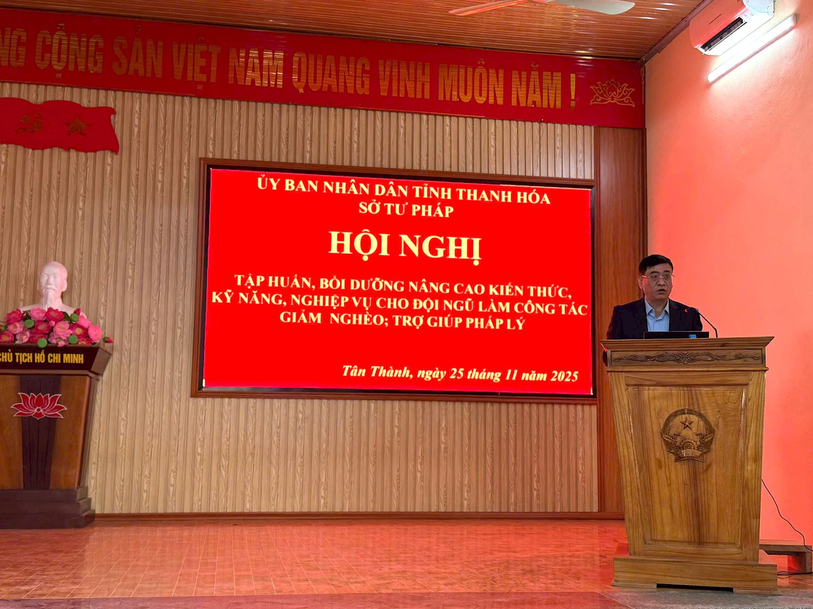 Thực hiện Chương trình mục tiêu quốc gia giảm nghèo tại Kế hoạch số 113/KH-UBND ngày 09/6/2025 của UBND tỉnh về việc triển khai, thực hiện Chương trình mục tiêu quốc gia (MTQG) giảm nghèo bền vững trên địa bàn tỉnh Thanh Hóa năm 2025, Sở Tư pháp tổ chức Hội nghị Tập huấn, bồi dưỡng, nâng cao kiến thức, kỹ năng nghiệp vụ cho đội ngũ làm công tác giảm nghèo; đội ngũ công tác trợ giúp pháp lý trên địa bàn các xã (thuộc tiểu dự án 1, Dự án 7 Chương trình mục tiêu quốc gia giảm nghèo bền vững) cho đội ngũ làm công tác giảm nghèo, cán bộ trợ giúp pháp lý, cán bộ nòng cốt cơ sở và người có uy tín trong cộng đồng tại các xã Tân Thành và xã Trung Hạ với các nội dung cụ thể như sau: