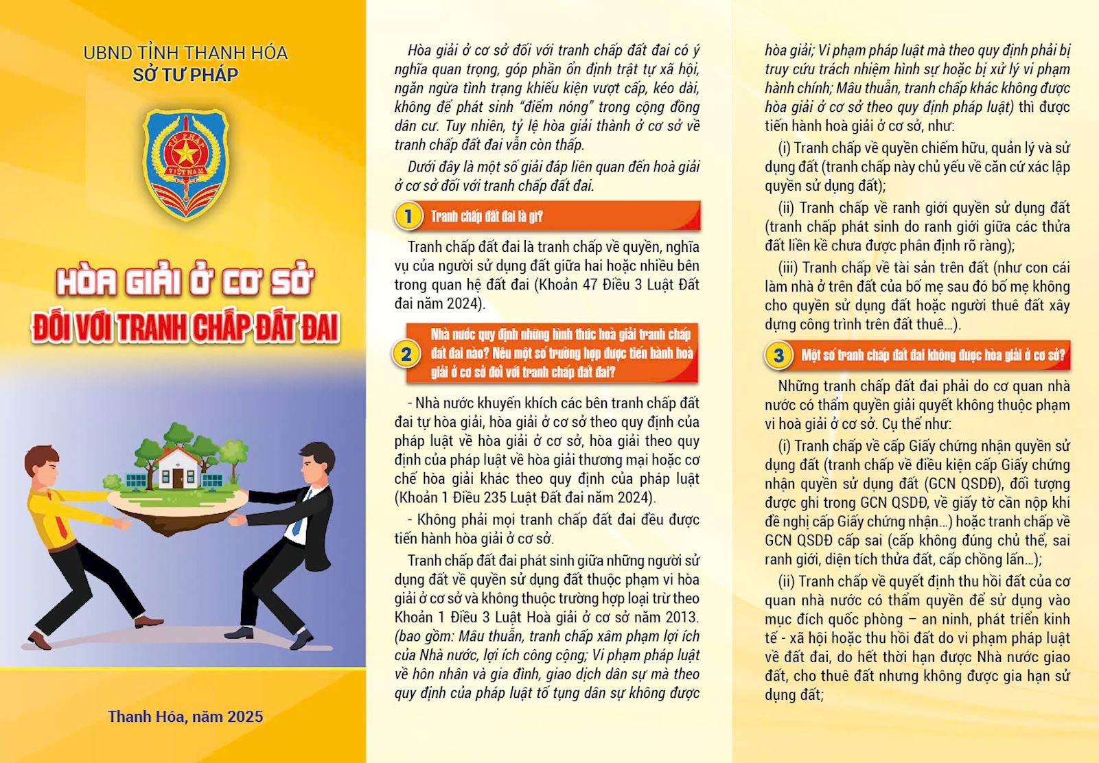 Sở Tư pháp đã biên soạn nội dung và in 25.000 Tờ gấp pháp luật “Hòa giải ở cơ sở đối với tranh chấp đất đai” để cấp phát miễn phí cho các cơ quan quản lý nhà nước về hòa giải ở cơ sở, các tổ hòa giải, hòa giải viên và nhân dân trên địa bàn tỉnh Thanh Hóa.