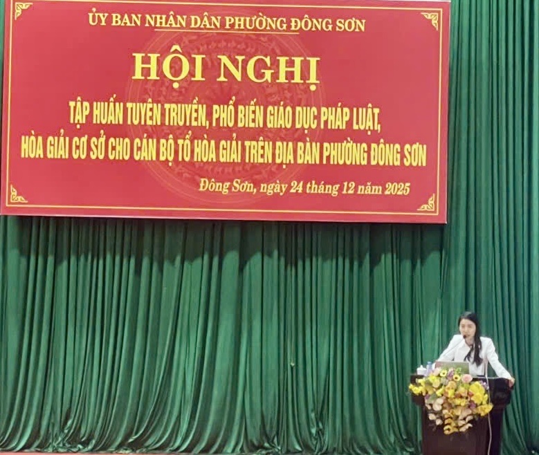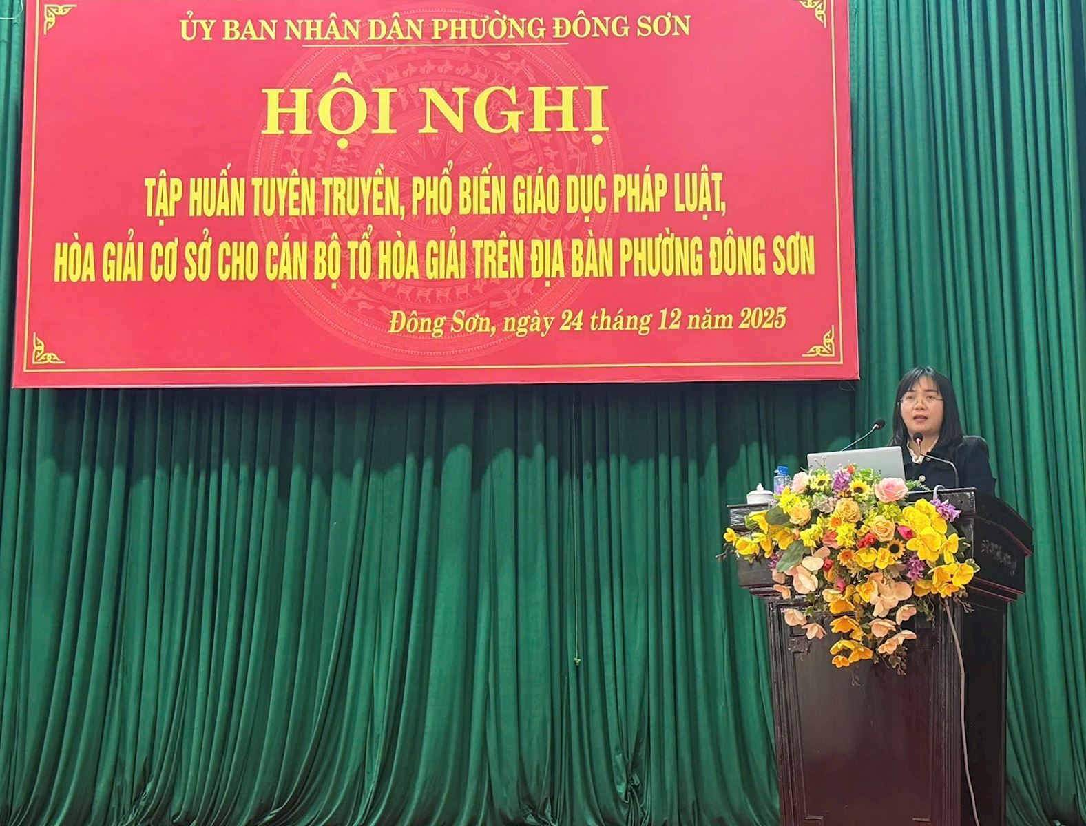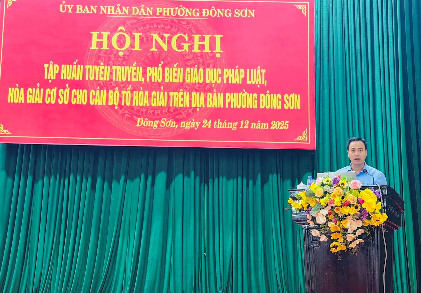 Thực hiện Kế hoạch số 45/KH-UBND ngày 08/9/2025 về tuyên truyền, phổ biến, giáo dục pháp luật, hòa giải ở cơ sở và xây dựng phường đạt chuẩn tiếp cận pháp luật năm 2025. Ngày 24/12/2025, UBND phường Đông Sơn đã tổ chức Hội nghị tập huấn công tác tuyên truyền, phổ biến, giáo dục pháp luật và hòa giải ở cơ sở cho đội ngũ cán bộ, hòa giải viên trên địa bàn phường.