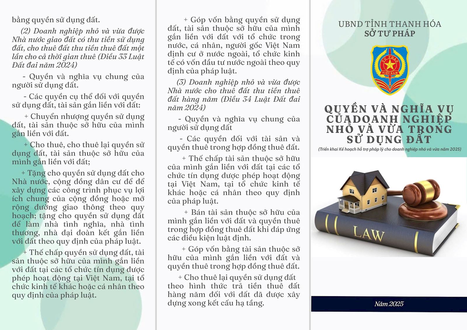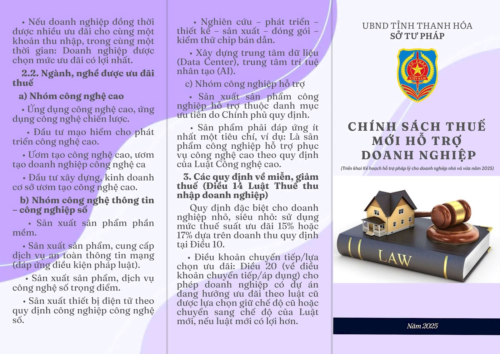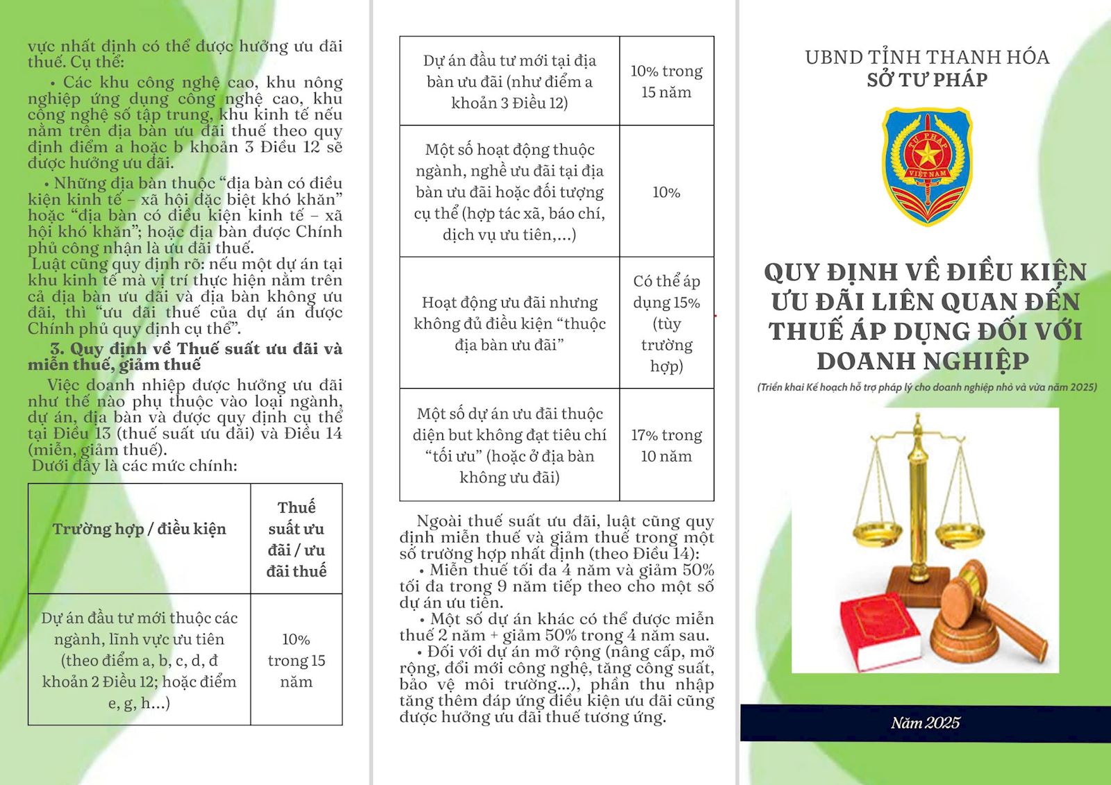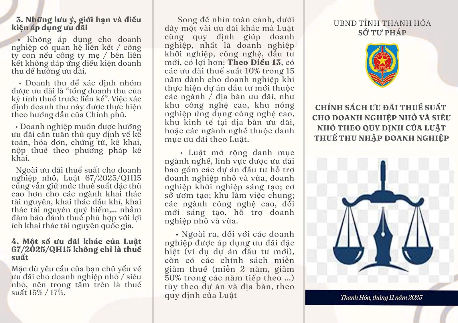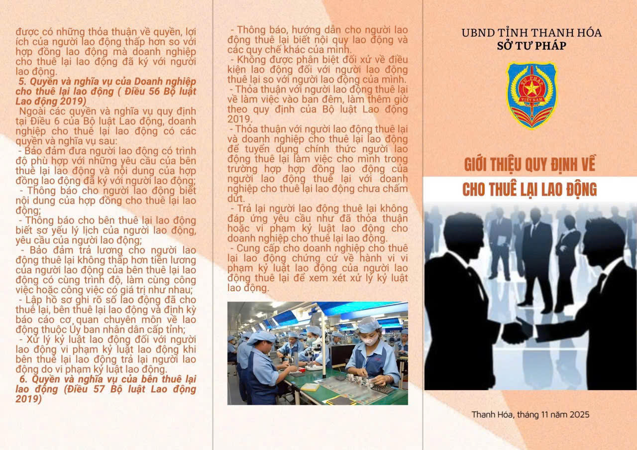 Thực hiện Kế hoạch số 492/KH-STP ngày 28/7/2025 về hỗ trợ pháp lý cho doanh nghiệp nhỏ và vừa trên địa bàn tỉnh năm 2025 , Sở Tư pháp đã biên soạn Tờ gấp liên quan đến doanh nghiệp. Nội dung Tờ gấp liên quan đến các lĩnh vực: Lao động, Đất đai, Đầu tư, Thuế thu nhập doanh nghệp. Hy vọng những nội dung này sẽ mang lại kiến thức pháp luật bổ ích cho doanh nghiệp trong gian tới.